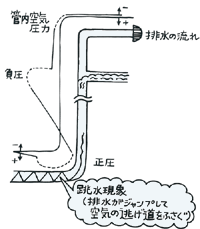 SHASE-S206-2000「給排水衛生設備・同解説」には、最下階は原則として別系統で排水桝まで配管することとなっています。排水立て管から排水横主管へ移行する部分では、排水が急激に方向転換を強いられるため、跳水現象を起こし高い正圧の発生によって、下層階の器具トラップ封水のはねだしのおそれがあります。