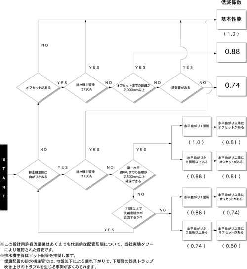 排水横主管の配管形態すなわち、管径、曲がりの数、曲がりまでの距離、オフセット配管の形態などの違いによって、排水立て管の性能は低下します。当社では社内実験の結果得られた、配管形態ごとの設計用許容流量値および低減率をフローチャートにより開示しています。なお、追加情報は、技術レポートで報告いたします。