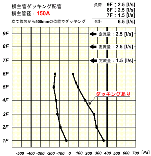 ・水平曲がりの条件と同様に、排水立て管芯からダッキングまでの距離を十分確保しないと、下層階の管内圧力は著しく大きくなります。