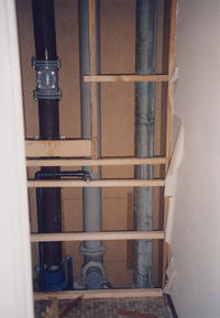 排水立て管の更新、2分割した排水立て管を掃除口継手で接続した例