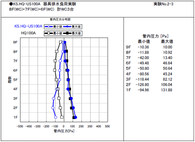 INAX社製超節水6L便器を使用した排水負荷実験では、3台同時排水時の管内圧力はシステム最小値が-126.80[Pa]で、システム最大値が+131.88[Pa]でした。次に代用洗濯槽を用いた洗剤排水負荷実験では、3台同時排水時の管内圧力は、システム最小値が-92.24[Pa]で、システム最大値が+155.76[Pa]でした。以上のことから、実際の使用状態を想定した排水負荷においても問題となるような圧力は発生しないことが確認できました。